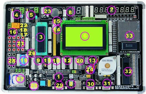 整机由以下数十个模块组成,功能强劲令人叹为观止!集成了基本上所有单片机应用中可能遇到的功能模块部份,你再也不必要去找其他零件,即可轻松完成您所需要的开发任务。我敢打赌这是你目前见到的功能最强的51开发板(其中12864液晶率先成为系统的标准配置。仅此价格即超过百元!同时率先引入sd卡,485通信,can总线,汉字屏等等高端模块,不象其他板子仅仅只能作几个跑马灯,数码管实验)